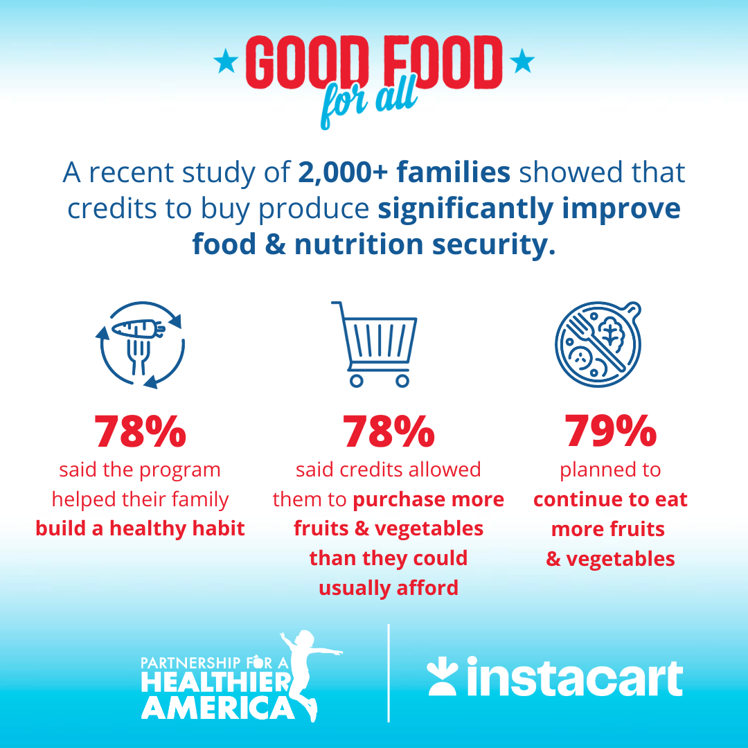 | Together with our partner Instacart, we're excited to share the impact results of our Good Food for All program in Indianapolis, and to announce an expansion of the program into four additional cities later this year. Launched in February, the Indianapolis program tested the feasibility of a produce credit model, in which families were given $50 in produce credits per month – redeemable through either a local brick-and-mortar store or online through Instacart Fresh Funds – for three months. Results showed that the pilot supported significant improvements in food and nutrition security for families. |